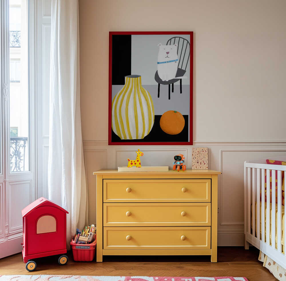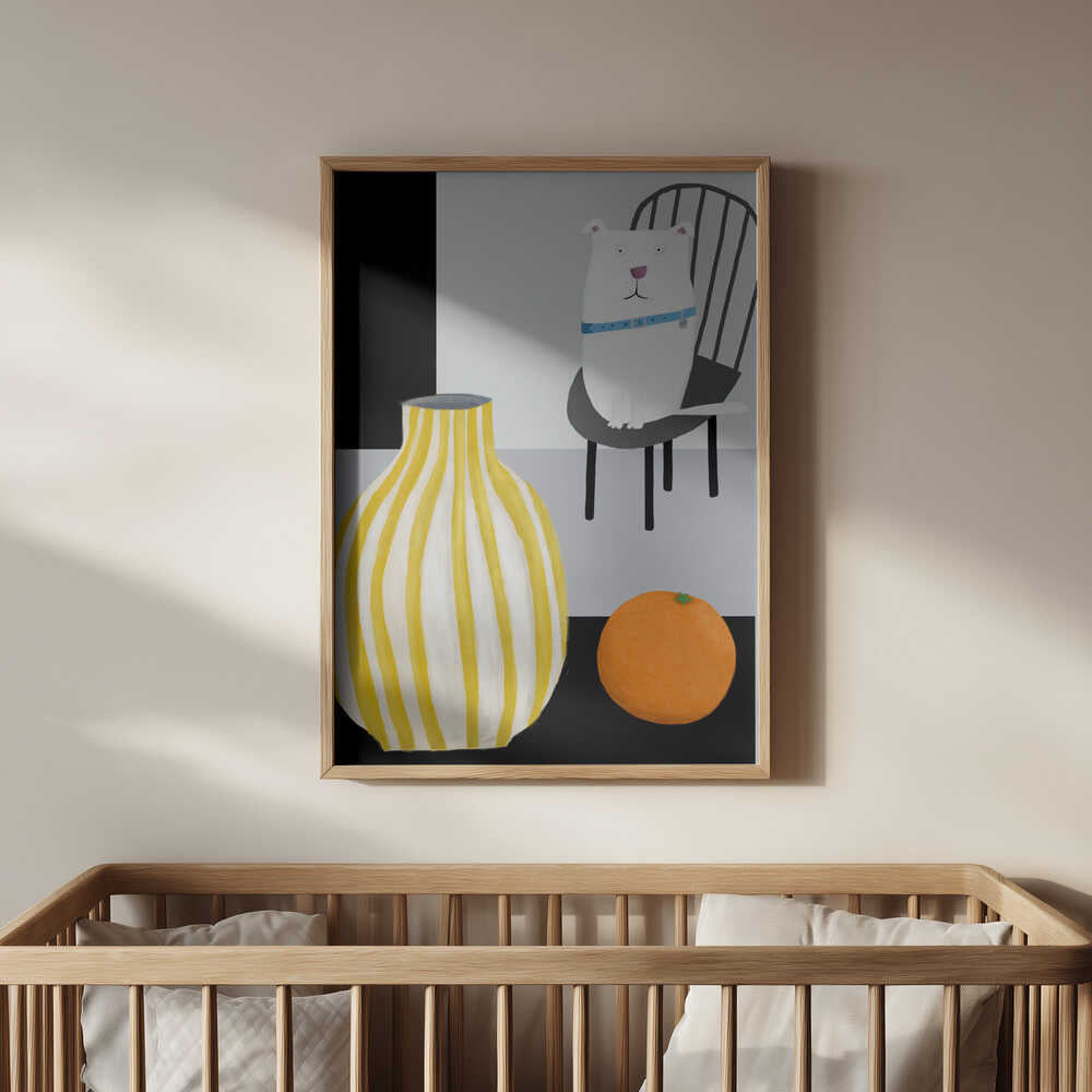 Add a playful touch of modern charm to your decor with this delightful wall art featuring a white dog on a chair beside a striped yellow vase and a bright orange fruit, set against a bold geometric background. Its minimalist composition and balanced palette help create a peaceful atmosphere without overwhelming your space. Designed to feel timeless yet playful, it sits comfortably above a crib, a reading nook, or a favorite study desk. A beautiful choice for nurseries, children’s rooms, and modern family spaces, it also pairs effortlessly with Scandinavian-inspired decor and gallery walls. Printed on premium museum-quality paper with a matte finish, it preserves every delicate detail and color for years to come.