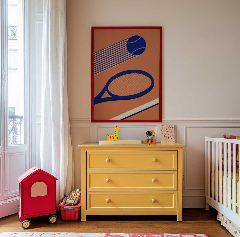 Add a sporty touch of energy to your decor with this modern wall art in deep navy and warm clay tones, featuring a minimalist tennis racket and ball in motion. Its minimalist composition and balanced palette help create a peaceful atmosphere without overwhelming your space. Designed to feel timeless yet playful, it sits comfortably above a crib, a reading nook, or a favorite study desk. A beautiful choice for nurseries, children’s rooms, and modern family spaces, it also pairs effortlessly with Scandinavian-inspired decor and gallery walls. Printed on premium museum-quality paper with a matte finish, it preserves every delicate detail and color for years to come.