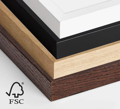 Our high-quality frames are available in black, white, oak, dark oak, and gold aluminum. The glass is made of acrylic, which is both lightweight and durable. All frames can be hung both vertically and horizontally. All our frames are manufactured in Estonia.