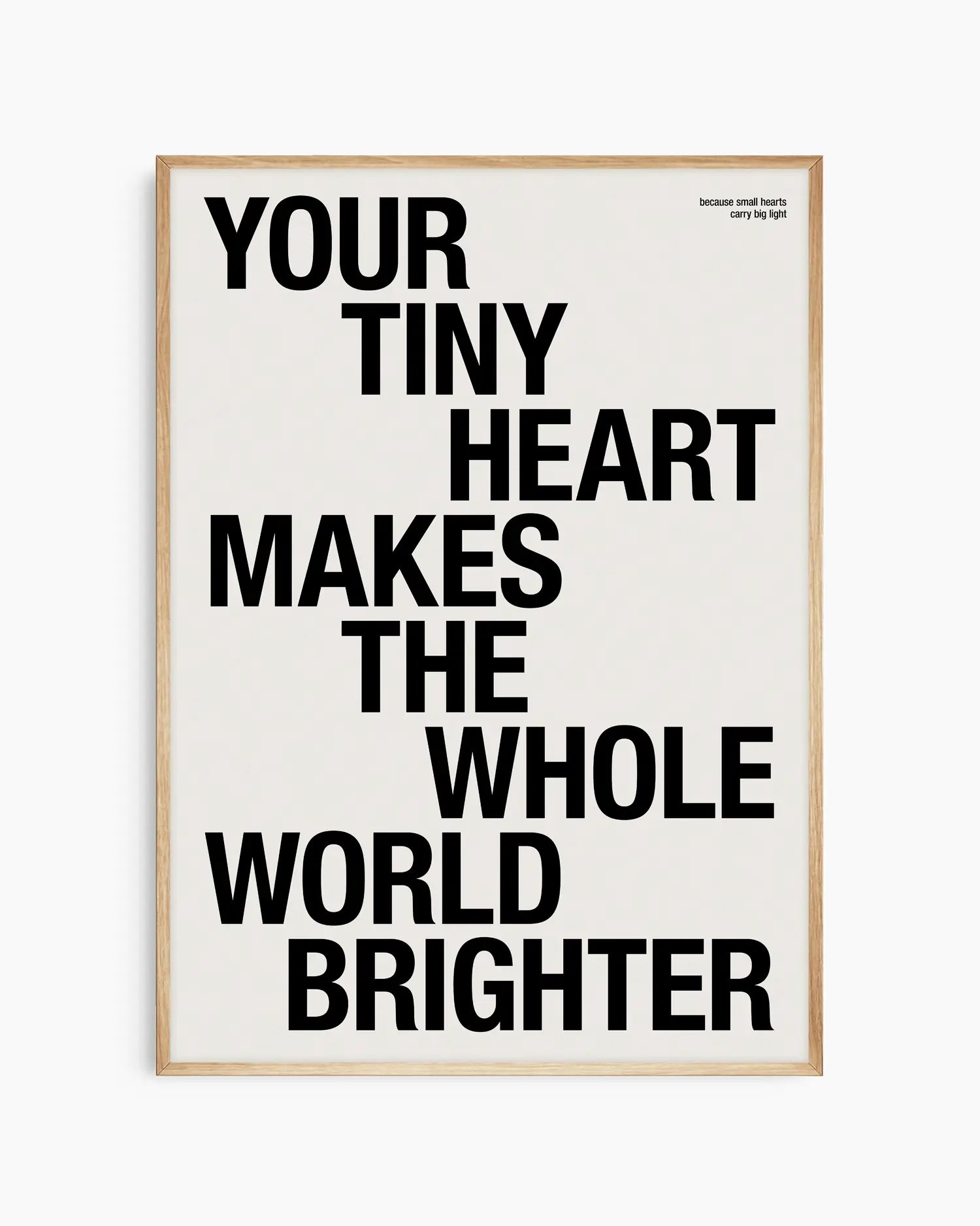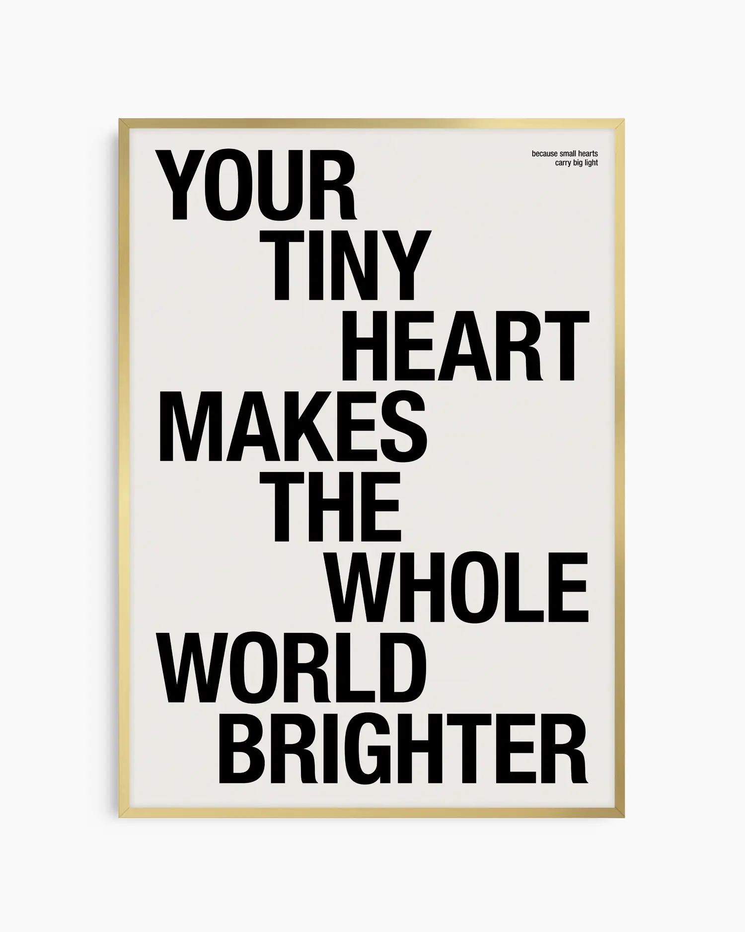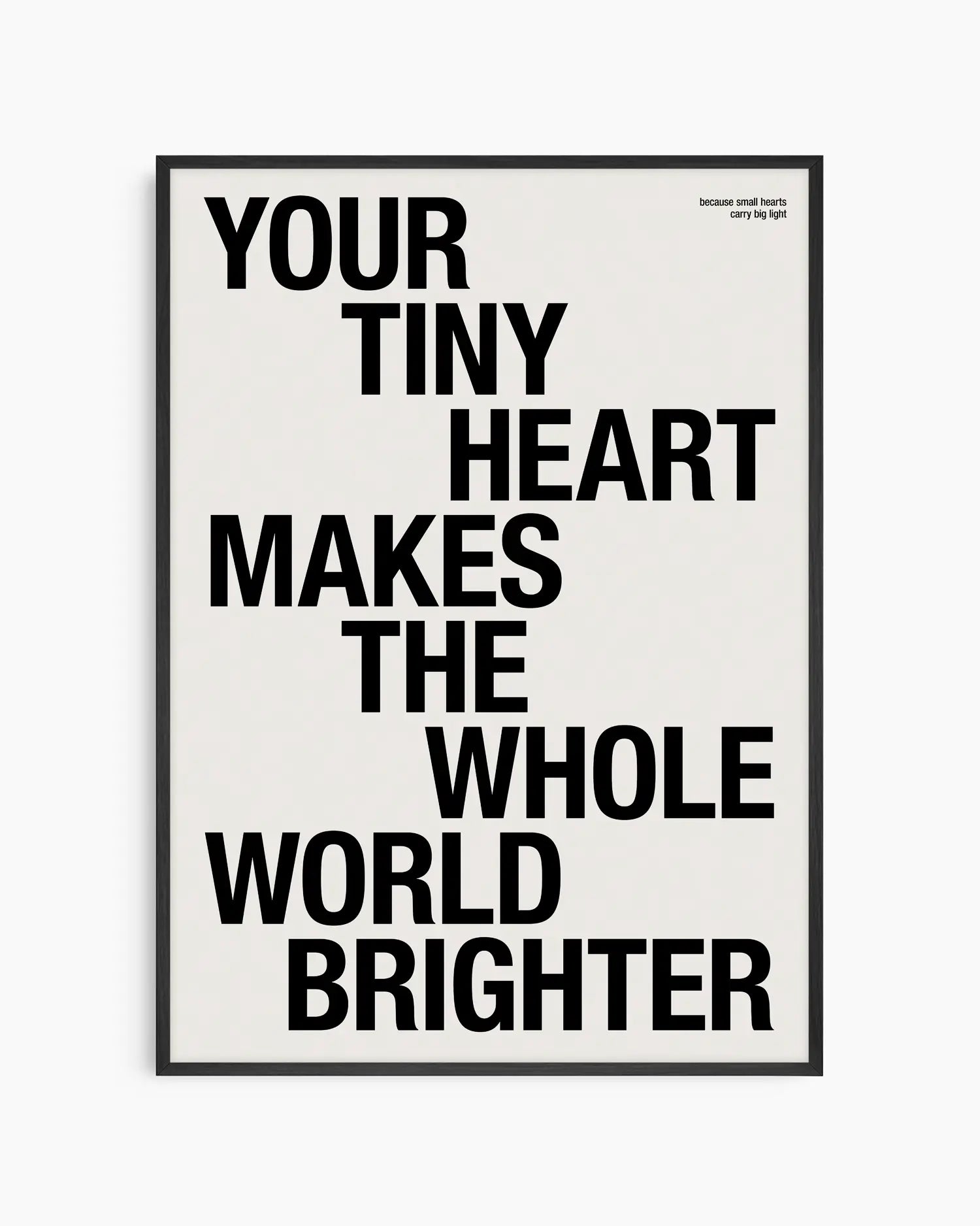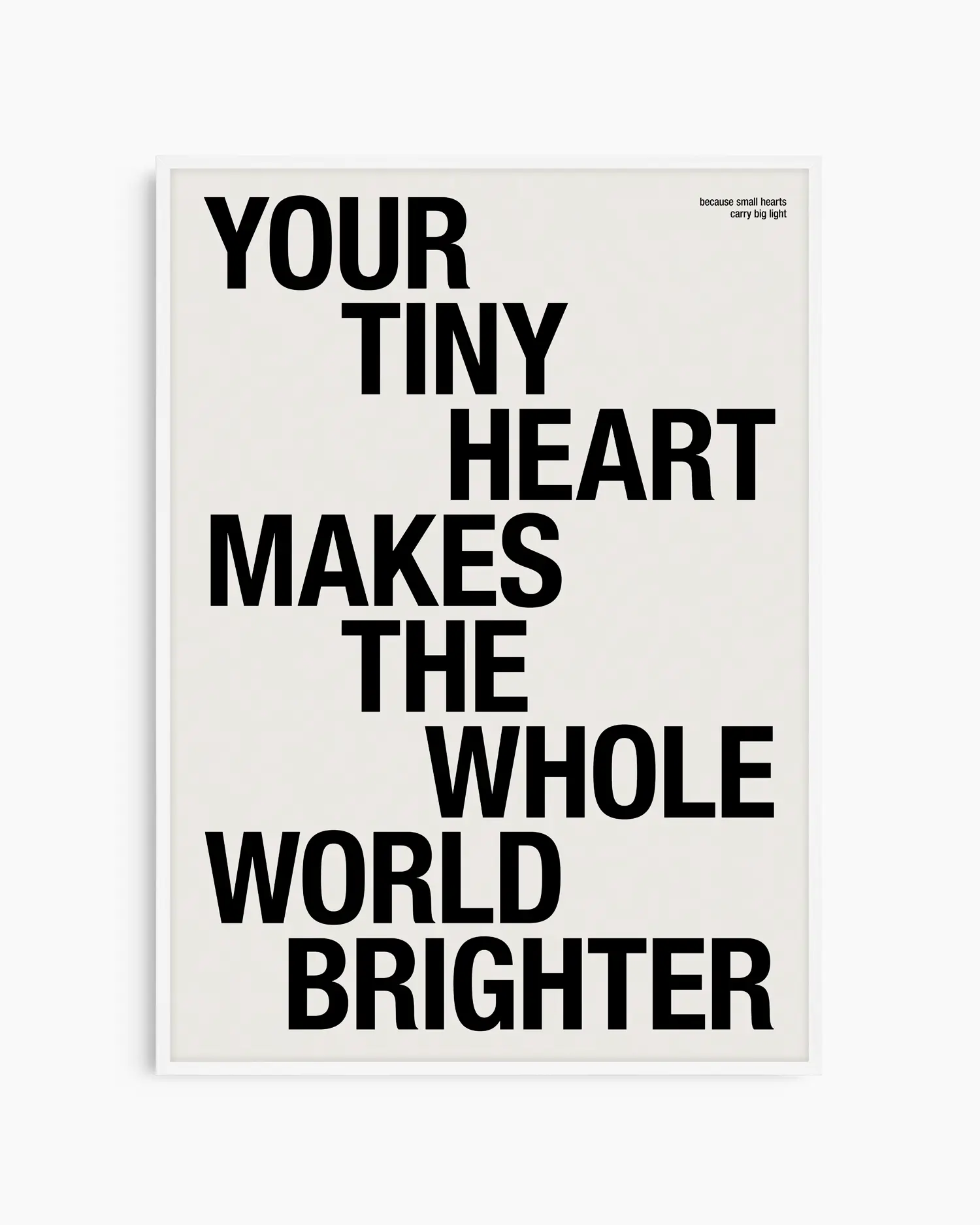 Celebrate the extraordinary power of a child’s presence with this modern and heartfelt wall print. With the message “Your Tiny Heart Makes the Whole World Brighter,” this artwork captures the pure magic, joy, and love a little one brings into every day.