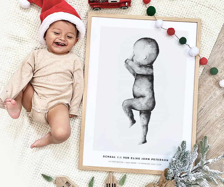 The Birth Poster is een reeks illustraties die je eraan herinnert hoe klein je baby was bij de geboorte. Het tijdloze kunstwerk is net zo groot als je baby was toen hij of zij ter wereld kwam. Als je baby 51 cm lang was, is de illustratie ook precies 51 centimeter groot. Onderaan de poster printen we de geboortegegevens van je baby – de naam, de lengte, het gewicht en de geboortedatum.