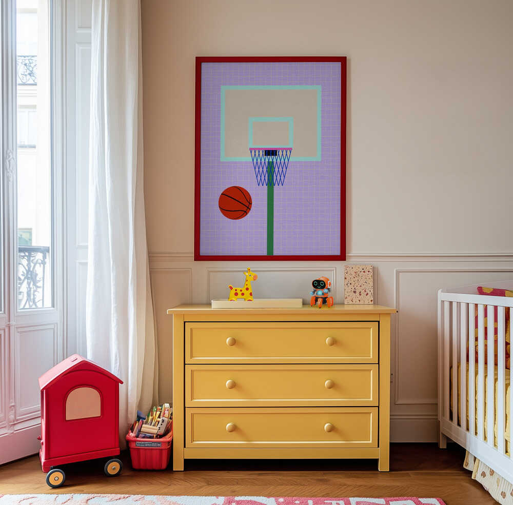 Add a sporty pop of color to your decor with this playful wall art featuring a basketball midair against a lavender grid backdrop and a minimalist hoop design. Its minimalist composition and balanced palette help create a peaceful atmosphere without overwhelming your space. Designed to feel timeless yet playful, it sits comfortably above a crib, a reading nook, or a favorite study desk. A beautiful choice for nurseries, children’s rooms, and modern family spaces, it also pairs effortlessly with Scandinavian-inspired decor and gallery walls. Printed on premium museum-quality paper with a matte finish, it preserves every delicate detail and color for years to come.